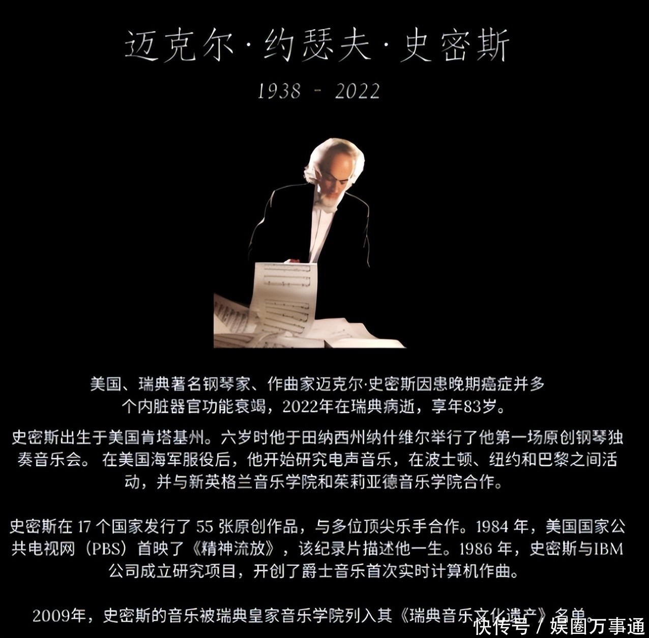 斯密斯出生于美国,有美国和瑞典双重国籍,是国际知名钢琴家,他从六岁就登台表演钢琴音乐会,有着过人的音乐天赋,他的音乐还被瑞典皇家音乐学院列入《瑞典音乐文化遗产》名单中,可见对世界各国音乐都有着强大影响力。