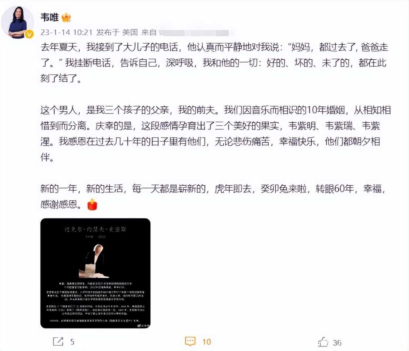文中韦唯提到了和斯密斯的婚姻,称与他的一切无论好坏,都已经过去,不再纠结于过去。
